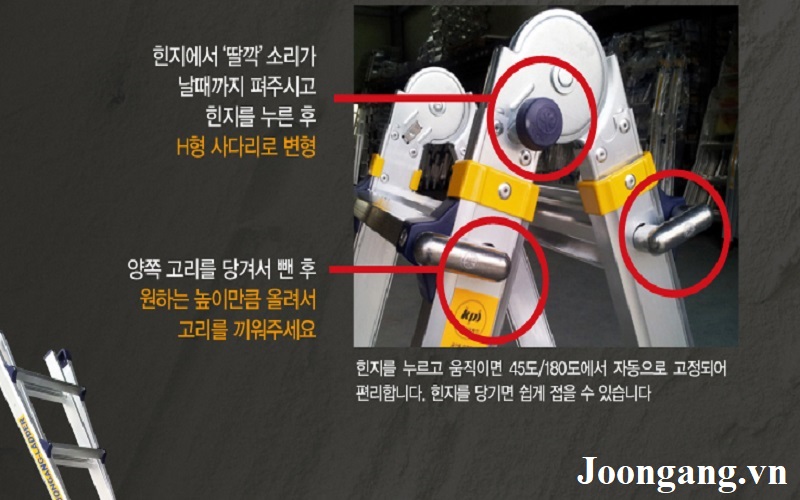1. Có thể tùy chỉnh được độ cao: thang nhôm Joongang được thiết kế thông minh với chốt và lỗ gài ở từng bậc thang để điều chỉnh độ cao theo ý muốn. Bạn có thể dễ dàng kéo trượt ở để đạt được độ cao mình mong muốn khi sử dụng ở bất kỳ vị trí nào